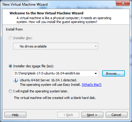ここでは、ISO イメージを使用して VMware Workstation 12 Player に Ubuntu 16.04 と Plesk 17.0 の仮想サーバをインストールする方法を説明します。