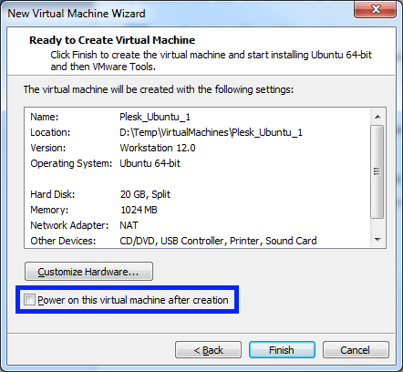 autoinst.isoで仮想 CD/DVD デバイスを無効する必要があります。これには、[Power on this virtual machine after creation]チェックボックスをオフにして、その後の数ステップを行います。[終了]をクリックします。