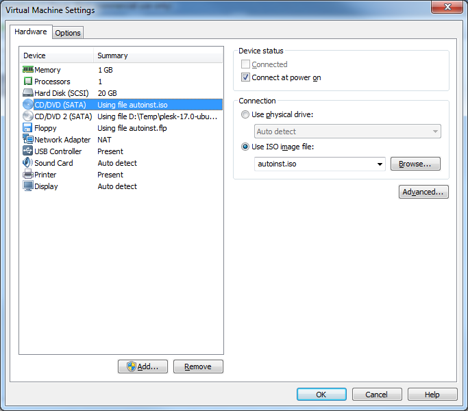 選擇 CD/DVD (SATA) 使用檔 autoinst.iso 點按 移除 。按一下 確定 保存更改。